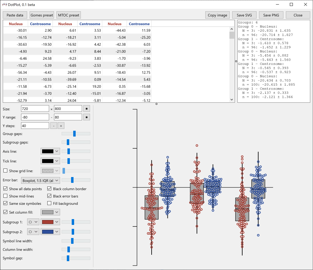 DotPlot is a free, stand-alone Windows program to draw bar/box plots with data points. Current version is v0.1 beta. It is provided “as-is”, without any express or implied warranty.